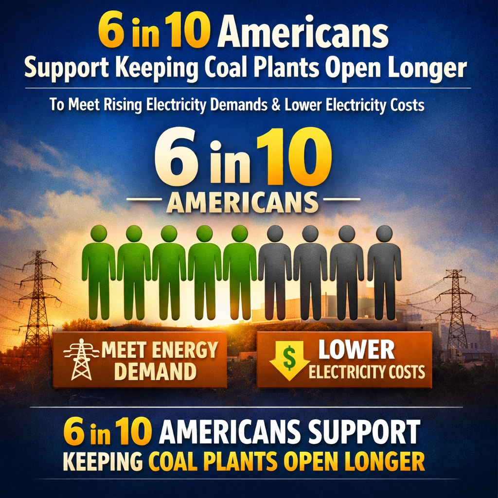 According to new national polling conducted by The Harris Poll for the National Mining Association, 57 percent of Americans support keeping coal plants open longer to meet growing energy demands and keep costs lower. Just 20 percent oppose.